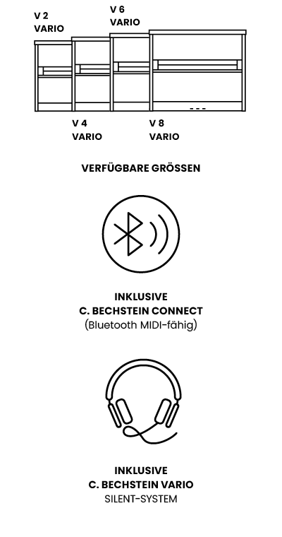 Träumst du davon dein Instrument auch lautlos über Kopfhörer spielen zu können? Unser Instrumente mit C. Bechstein VARIO erlauben dir eine einfache Stummschaltung deines Instruments – und schon kannst du zu jeder Tages- und Nachtzeit hemmungslos komponieren, interpretieren und improvisieren. Der hochwertig gesampelte Klang erstrahlt über den gesamten Dynamikbereich des Instruments und macht einzelne Töne förmlich greifbar. Zwei Kopfhöreranschlüsse ermöglichen, dass ein Freund oder Lehrer deinem Spiel zuhört oder ihr zusammen spielt.